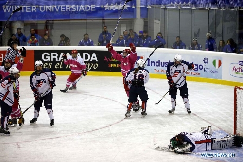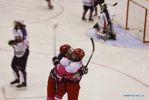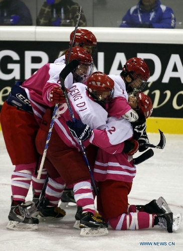 China's players celebrate their second goal during the women's ice hockey competition against the United States at the 27th World Winter Universiade in Granada, Spain, Feb. 5, 2015. China won 2-1. (Xinhua/Meng Yongmin)