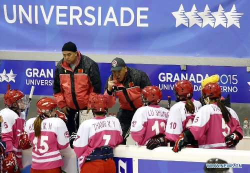 China's coach Zhang Zhinan (R Back) talks to players during the women's ice hockey competition against the United States at the 27th World Winter Universiade in Granada, Spain, Feb. 5, 2015. China won 2-1. (Xinhua/Meng Yongmin)