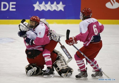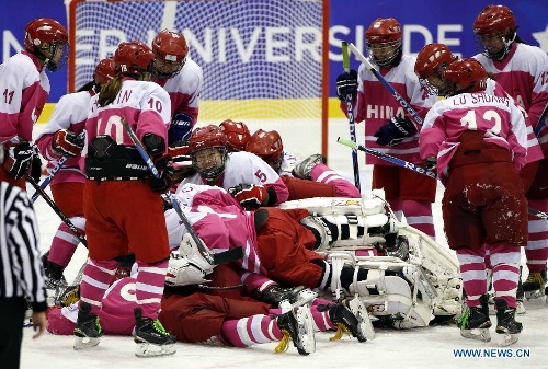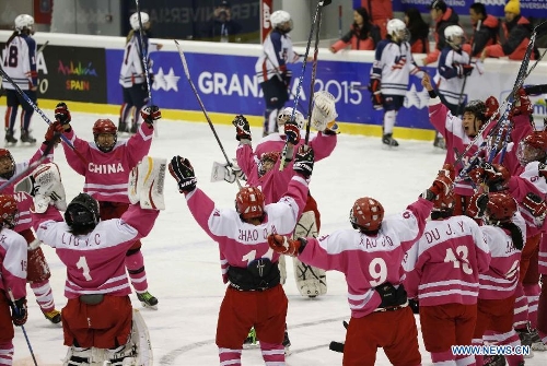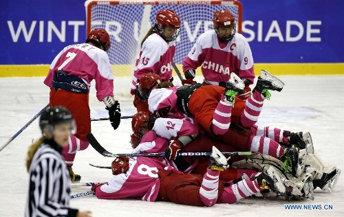 China's players celebrate their victory after winning the women's ice hockey competition against the United States at the 27th World Winter Universiade in Granada, Spain, Feb. 5, 2015. China won 2-1. (Xinhua/Meng Yongmin)