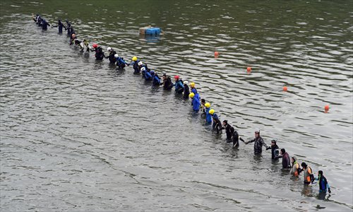 Rescuers and divers search for missing passengers at the crash site of the TransAsia ATR 72-600 turboprop plane in the Keelung river in New Taipei City on Friday. The plane crashed shortly after take-off from Taipei on Wednesday, hitting an elevated road as it banked steeply away from buildings and into the Keelung River. Photo: AFP