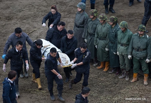 Rescuers transfer the body of a plane crash victim on the bank of Keelung River in Taipei, southeast China's Taiwan, February 7, 2015. Rescuers on Saturday morning recovered three more bodies, raising the death toll from the TransAsia Airways plane crash to 38. Five passengers are still missing. (Xinhua/Jin Liwang)