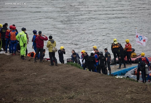 Rescuers transfer the body of a plane crash victim on the bank of Keelung River in Taipei, southeast China's Taiwan, February 7, 2015. Rescuers on Saturday morning recovered three more bodies, raising the death toll from the TransAsia Airlines plane crash to 38. Five passengers are still missing. (Xinhua/Jin Liwang)