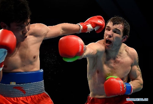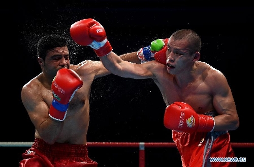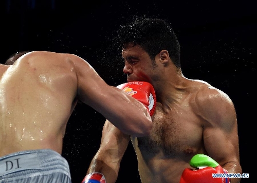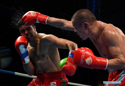Zhou Di (R) of China fights against Harnouf Said of Morocco during their men's 75kg match at the World Series of Boxing (WSB), in Sanya, South China's Hainan Province, February 13, 2015. China won with 4-1 in total. (Xinhua/Guo Cheng)