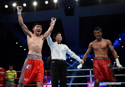 Diao Jianhao (L) of China celebrates victory after his match against Hamout Mohamed of Morocco during the men's 56kg match at the World Series of Boxing (WSB), in Sanya, South China's Hainan Province, February 13, 2015. China won with 4-1 in total. (Xinhua/Guo Cheng)