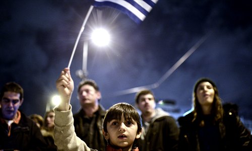 A child waves the national flag of Greece as crowds gather in front of the Greek parliament in Athens on February 5, 2014, in support of the new anti-austerity plan. Photo: AFP