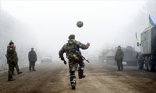 Ukrainian servicemen play soccer on a road at Svitlodarsk, approaching Debaltseve on Sunday. A cease-fire in Ukraine was cautiously observed by both sides, despite accusations by Kiev and the US that Russia had fueled a final push by rebels to gain territory before the deadline. Ukrainian President Petro Poroshenko ordered troops to abide by the truce from midnight, in line with a deal reached in Minsk earlier this week with the leaders of Russia, Germany and France. Photo: AFP