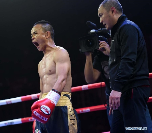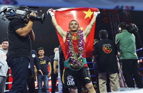 Xiong Chaozhong (C) of China celebrates after defeating Hiroya Yamamoto of Japan in a WBC minimumweight title match in Wenshan, southwest China's Yunnan Province, Feb. 22, 2015. Xiong Chaozhong claimed the title. (Xinhua/Lin Yiguang)