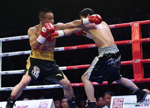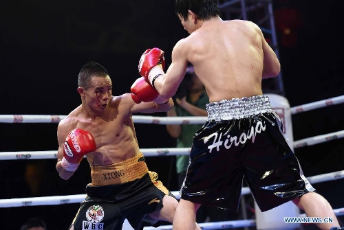 Xiong Chaozhong (L) of China competes during a WBC minimumweight title match against Hiroya Yamamoto of Japan in Wenshan, southwest China's Yunnan Province, Feb. 22, 2015. Xiong Chaozhong claimed the title. (Xinhua/Lin Yiguang)