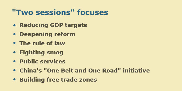 This year both local and national "two sessions" will focus on reducing GDP targets, deepening reform, the rule of law, fighting smog, public services, China's "One Belt and One Road" initiative, and building free trade zones.