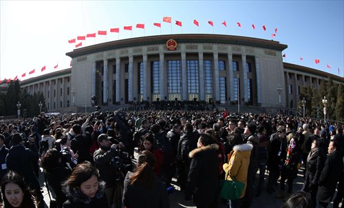 Chinese reporters on Tuesday gather in front of the Great Hall of the People where the onging two sessions are being held. Photo: IC