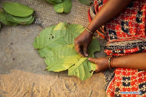 A villager makes a leaf plate at a village of Birbhum district in West Bengal, India, March 4, 2015. In north and east India, leaves from Sal (botanical name Shorea Robusta) tree are made into plates, which are popular during traditional meals, festivals and in temples. As sal trees are widely grown in the Birbhum district of West Bengal in India, local villagers earn their bread by selling their handmade leaf plates. (Xinhua/Zheng Huansong)