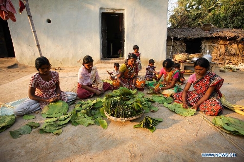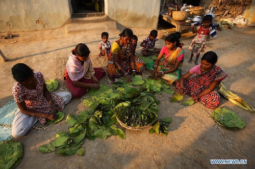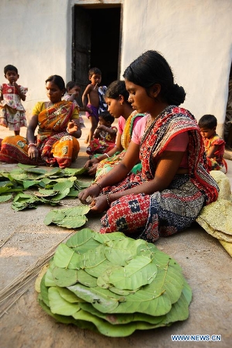Villagers make leaf plates at a village of Birbhum district in West Bengal, India, March 4, 2015. In north and east India, leaves from Sal (botanical name Shorea Robusta) tree are made into plates, which are popular during traditional meals, festivals and in temples. As sal trees are widely grown in the Birbhum district of West Bengal in India, local villagers earn their bread by selling their handmade leaf plates. (Xinhua/Zheng Huansong)