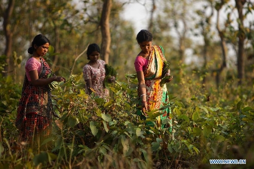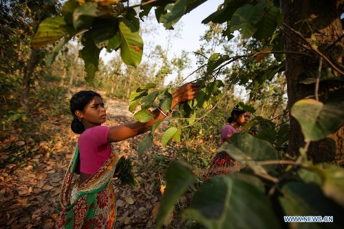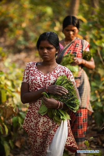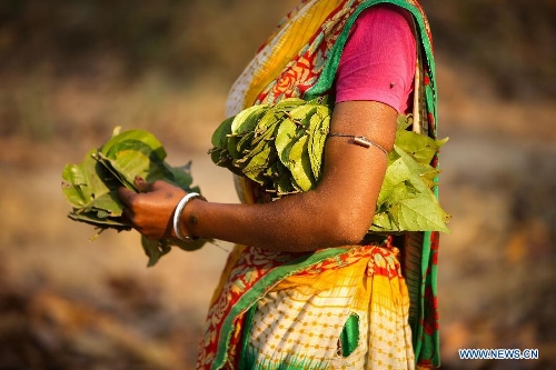A villager collects leaves from the sal tree at a village of Birbhum district in West Bengal, India, March 4, 2015. In north and east India, leaves from Sal (botanical name Shorea Robusta) tree are made into plates, which are popular during traditional meals, festivals and in temples. As sal trees are widely grown in the Birbhum district of West Bengal in India, local villagers earn their bread by selling their handmade leaf plates. (Xinhua/Zheng Huansong)