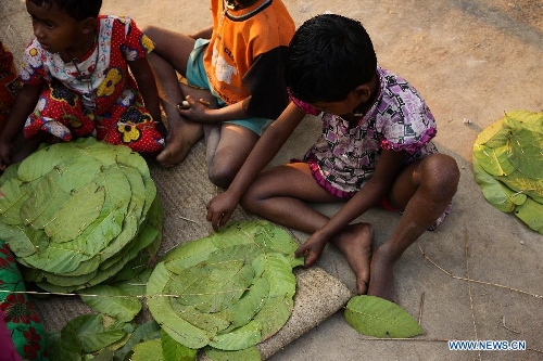 Children make leaf plates at a village of Birbhum district in West Bengal, India, March 4, 2015. In north and east India, leaves from Sal (botanical name Shorea Robusta) tree are made into plates, which are popular during traditional meals, festivals and in temples. As sal trees are widely grown in the Birbhum district of West Bengal in India, local villagers earn their bread by selling their handmade leaf plates. (Xinhua/Zheng Huansong)