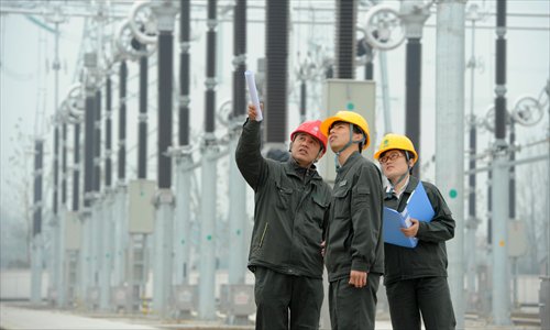 Workers of the State Grid inspect a substation in Huainan, East China's Anhui Province. Photo: CFP