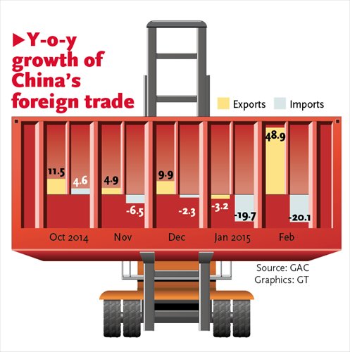 February exports amounted to 1.04 trillion yuan ($166.3 billion) and imports reached 666.1 billion yuan, resulting in a trade surplus of 370.5 billion yuan, compared with a 137.3 billion yuan trade deficit in the same period of 2014, according to the GAC.
