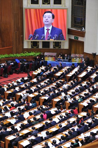 China's top legislator Zhang Dejiang delivers a work report at a meeting of the National People's Congress's annual session in Beijing on Sunday. Photo: CFP