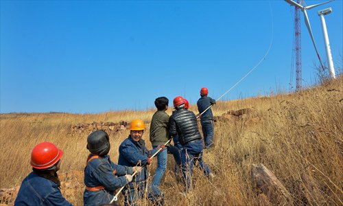 Workers install a wind turbine in Yiyang county, Central China's Henan Province. Photo: IC