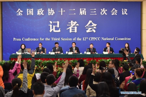 Zhu Weiqun(C), Huang Jiefu(3rd R), Hu Xiaoyi(3rd L), Li Yanhong(2nd R), Yu Minhong(2nd L), members of the 12th National Committee of the Chinese People's Political Consultative Conference (CPPCC), give a press conference during the third session of the 12th CPPCC National Committee in Beijing, capital of China, March 11, 2015. (Xinhua/Li Xin)