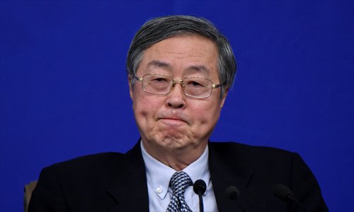 Zhou Xiaochuan, the governor of the People's Bank of China, speaks at a press conference on financial reform during the third session of the 12th National People's Congress in Beijing on Thursday. Photo: AFP