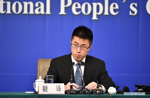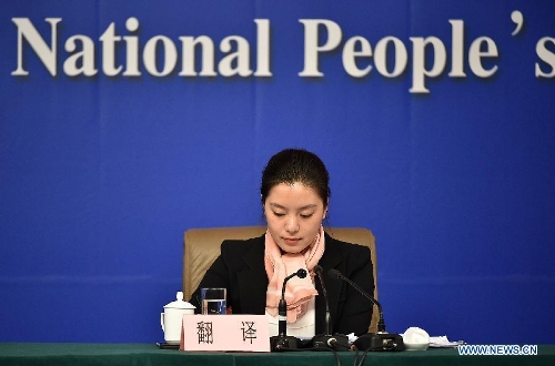 An interpreter works at a press conference given by Zhang Mao, minister of the State Administration for Industry and Commerce (SAIC), during the third session of the 12th National People's Congress (NPC) in Beijing, capital of China, March 9, 2015. (Xinhua/Li Ran)