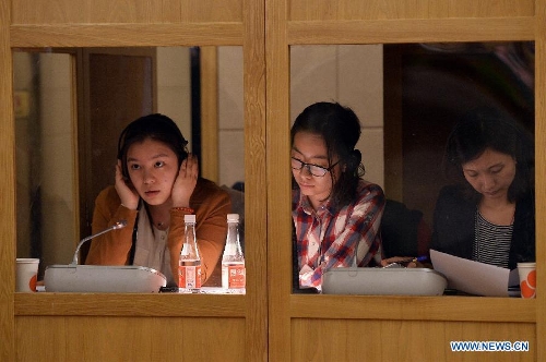 Interpreters work at a press conference given by Liu Binjie, Wang Shengming, Yin Zhongqing, Yuan Si, Liu Zhenwei, five senior members from the special committees of China's National People's Congress (NPC), during the third session of the 12th NPC in Beijing, capital of China, March 10, 2015. (Xinhua/Li Xin)
