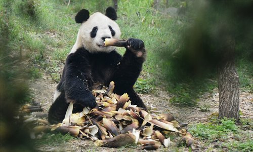 A panda enjoys a meal of bamboo shoots in a rescue center for wild animals in Shaanxi Province. Photo: CFP