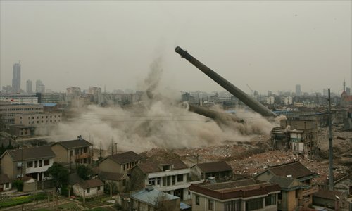 Two chimney towers at a power plant in Nantong, Jiangsu Province are demolished by explosives in 2010. Photo: CFP