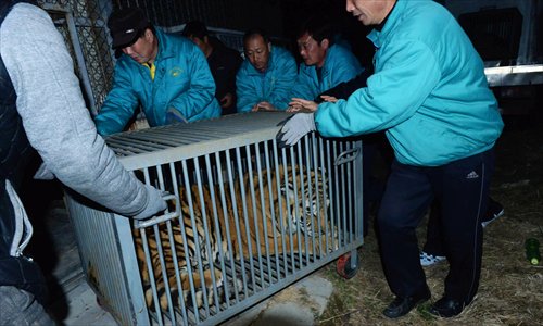 A female tiger, which was illegally kept in an apartment building in Pingdu, is transferred to a wildlife center in Qingdao, Shandong Province on February 26. Photo: IC