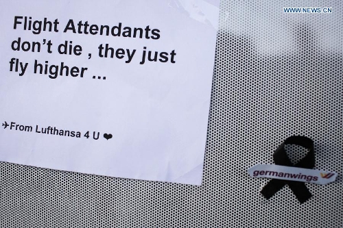 Messages to mourn victims of the crashed plane of Germanwings are seen at the Tegel airport in Berlin, Germany, on March 25, 2015. An Airbus A320 of the German low-cost airline Germanwings with 150 people on board crashed on Tuesday in southern France, French authorities confirmed. Photo: Xinhua