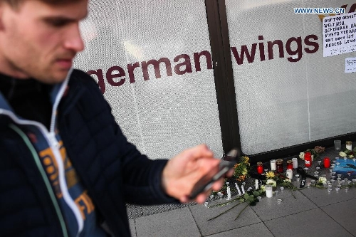 A man walks by flowers and candles mourning victims of the crashed plane of Germanwings at the Tegel airport in Berlin, Germany, on March 25, 2015. An Airbus A320 of the German low-cost airline Germanwings with 150 people on board crashed on Tuesday in southern France, French authorities confirmed. Photo: Xinhua