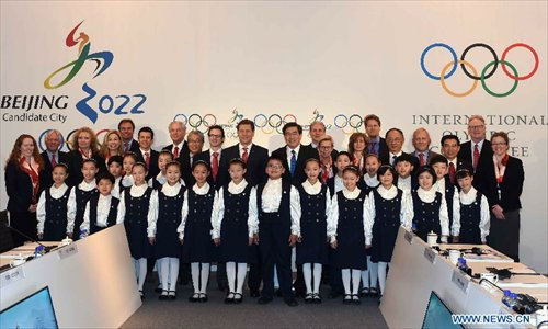 Delegates pose for photos during the closing ceremony of presentations of the Beijing 2022 Olympic Winter Games Bid Committee for the IOC Evaluation Commission in Beijing, capital of China, on March 28, 2015. Photo:Xinhua