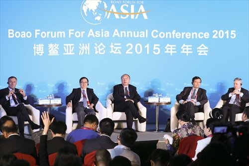 Michael Taylor, Moody's chief credit officer for Asia-Pacific (from right), China's Finance Minister Lou Jiwei, Huang Qifan, mayor of Southwest China's Chongqing Municipality, Li Jian'ge, chairman at Shenyin & Wanguo Securities, and former French Commerce Minister Jean-Marie Bockel discuss government debt during the Boao Forum on Friday. Photo: CFP