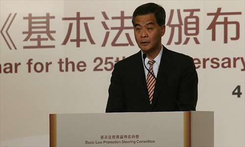 Hong Kong Chief Executive Leung Chun-ying speaks at a seminar for the 25th anniversary of the promulgation of the Basic Law in south China's Hong Kong, April 4, 2015. The Basic Law, adopted on April 4, 1990, embodies the vision of "one country, two systems," a pragmatic solution allowing China to incorporate the political and economic complexities of Hong Kong. Photo:Xinhua