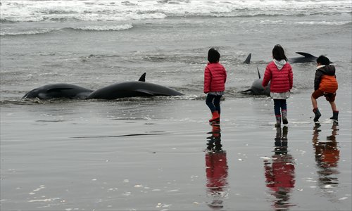 Children look on as residents attempt to save melon-headed whales beached on the shore of Hokota city, northeast of Tokyo on Friday. More than 130 melon-headed whales, a member of the dolphin family usually found in the deep ocean, beached in Japan on Friday, sparking frantic efforts by locals and coastguards to save them. Photo: AFP