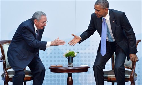 US President Barack Obama and Cuban President Raul Castro reach out to shake hands during a meeting on the sidelines of the Summit of the Americas at the ATLAPA Convention Center on Saturday in Panama City, Panama. Photo: AFP