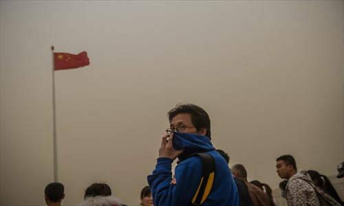 A tourist in Tiananmen Square uses part of his jacket to cover his nose and mouth during a sandstorm on Wednesday. Photo: Li Hao/GT