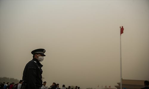 A police officer in Beijing’s Tiananmen Square wears a mask during a sudden sandstorm on Wednesday. Photo: Li Hao/GT