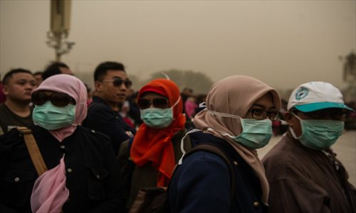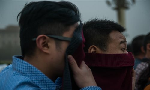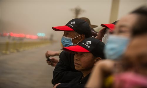 Tourists who came to watch the flag-lowering ceremony at Tiananmen Square in the afternoon wear masks to protect themselves from a sandstorm on Wednesday. Photo: Li Hao/GT