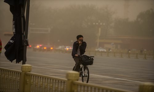 A man riding a bicycle covers his nose during a sandstorm in Beijing on Wednesday. Photo: Li Hao/GT