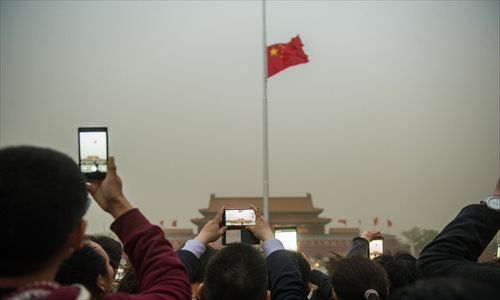 Tourists take photographs of a flag-lowering ceremony in Tiananmen Square at the height of a sandstorm in Beijing on Wednesday. Photo: Li Hao/GT