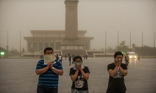 Tourists cover their faces after a sudden sandstorm swept through Beijing on Wednesday. Photo: Li Hao/GT