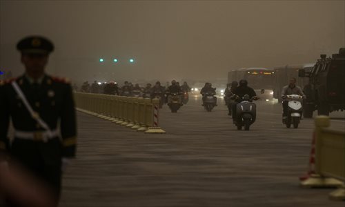 Motorists in Beijing navigate through a severe sandstorm on Wednesday. Photo: Li Hao/GT