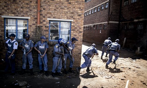 South African anti-riot policemen raid a hostel in Benoni, outside Johannesburg, on April 16. Local residents have been protesting against the presence of foreign-owned shops in the area. Photo: AFP