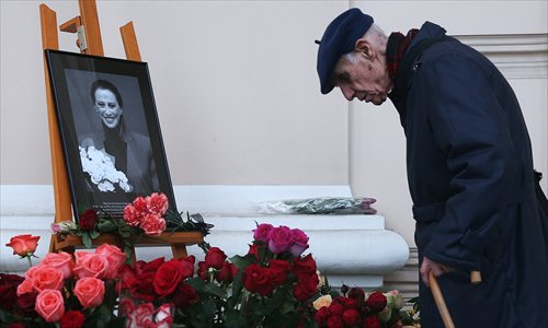 An old man lays flowers outside Moscow's Bolshoi Theatre in memory of Russian ballet dancer Maya Plisetskaya. Plisetskaya died aged 89 on Saturday. Photo: IC