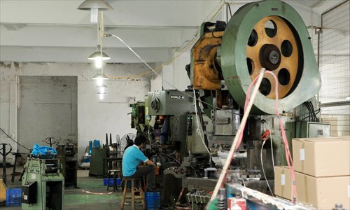 A worker fixes a machine in a metal factory in Dongguan, Guangdong Province, in March 2015. The factory planned to introduce more machines and robots to reduce the number of workers. Photo: CFP