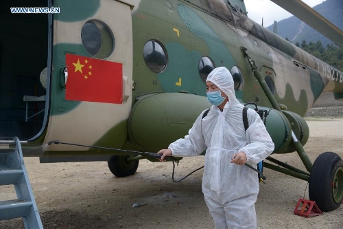 An inspection and quarantine worker sanitizes a helicopter in Gyirong County, southwest China's Tibet Autonomous Region, May 6, 2015. Three helicopters from China's air force flew to Nepal on Wednesday morning to help with transportation and rescue. (Xinhua/Wang Shoubao)
