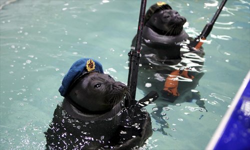 Two seals dressed as soldiers swim during a show marking the 70th anniversary of the end of World War II at an aquatic park in the Siberian city of Irkutsk, Russia, on Saturday. Photo: CFP