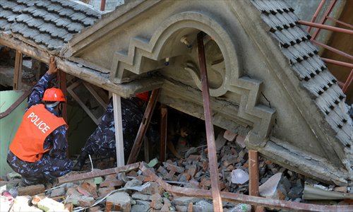 Rescuers and a sniffer dog search for survivors at a collapsed house in Kathmandu on Tuesday, after a 7.3-magnitude earthquake hit Nepal. Photo: AFP
