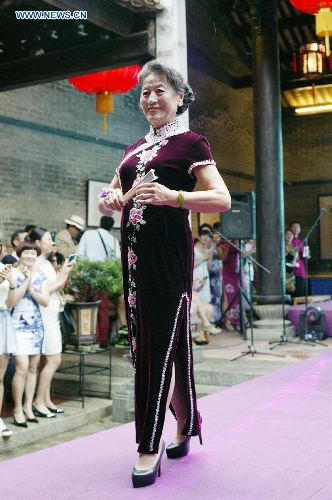 Cheongsam lovers present cheongsams, a traditional Chinese women's dress also known as Qipao, during a cheongsam show in Zhuhai, south China's Guangdong Province, May 16, 2015. Sponsored by China Qipao Society, a worldwide cheongsam show was held Saturday, with the participation of some 150,000 cheongsam lovers from 420 branches of China Qipao Society around the world. (Xinhua/Wei Meng)